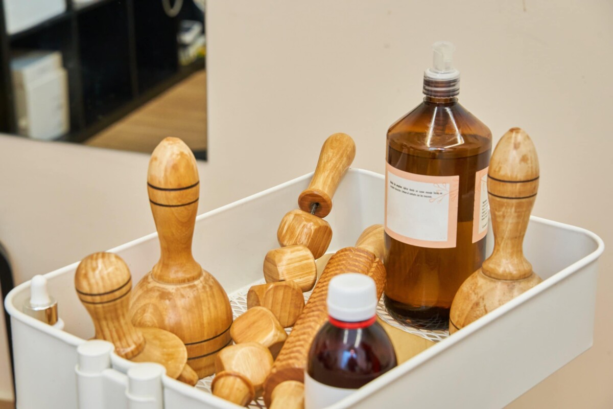 Wood therapy (sometimes called “maderotherapy”) uses a curated set of smooth wooden instruments to deliver rhythmic, rolling, and contouring strokes. Unlike deep‑tissue massage, wood therapy emphasizes movement over pressure. The consistent cadence and tool shapes allow us to cover large areas efficiently and encourage fluid movement without strain. It’s a technique many clients choose when they want an energizing session that also supports surface smoothing—especially along the waist, hips, thighs, and arms.